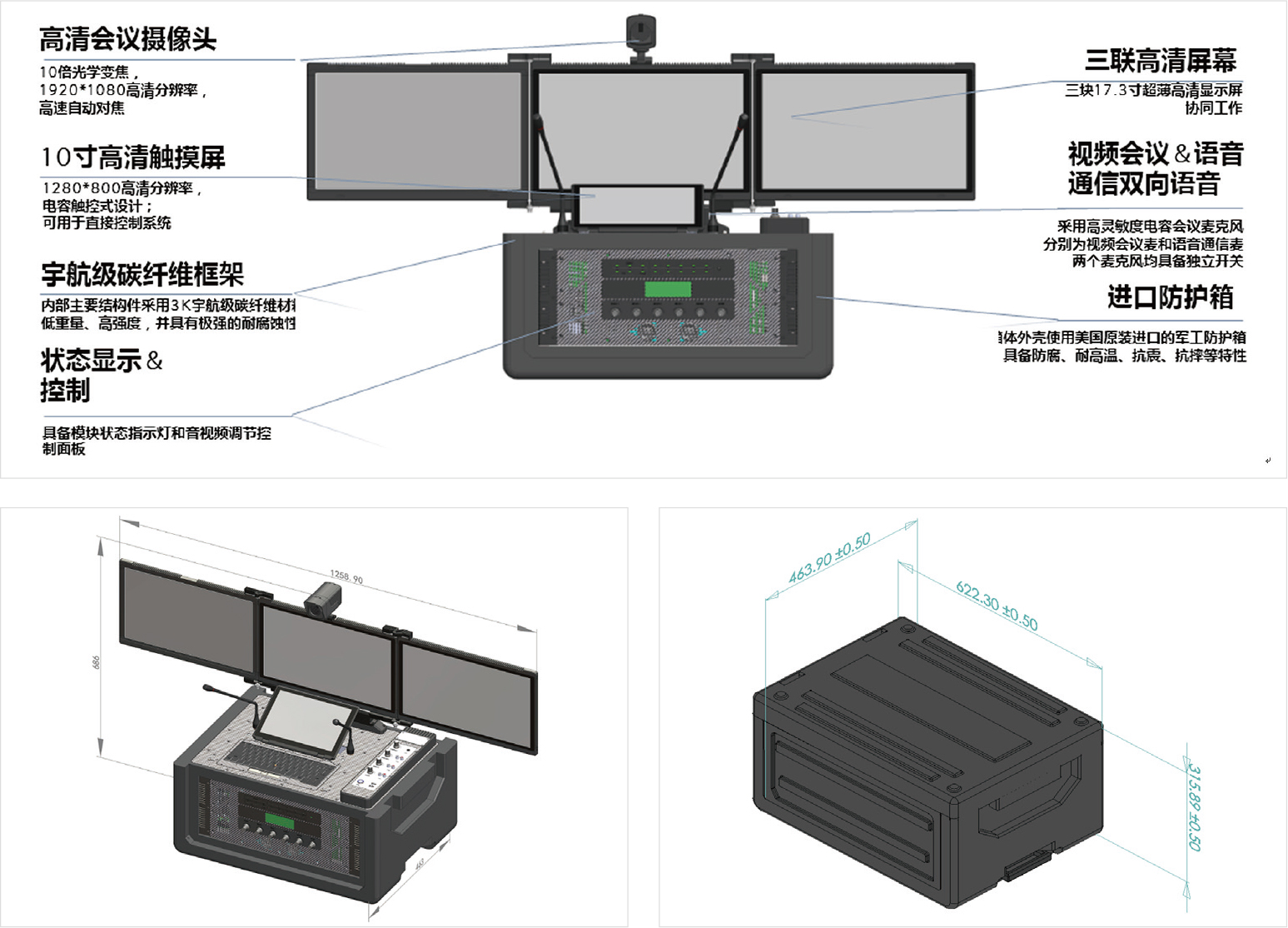 四屏協同顯控:設備自身具備四塊屏幕,其中三屏采用翻折式設計(單屏尺寸為17.3寸),一屏觸控(10.1寸),四屏聯動使用;